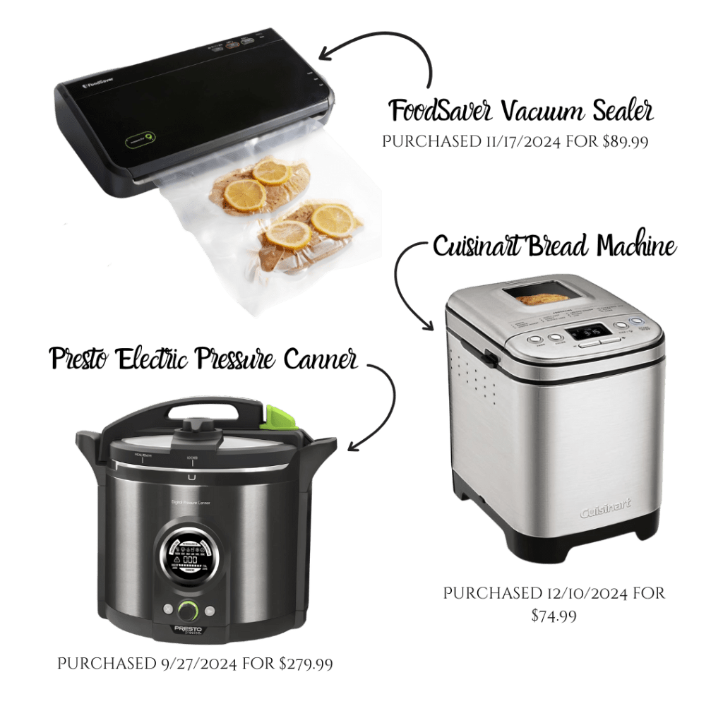 To this end, we got a FoodSaver vacuum sealer, a Presto electric pressure and boiling canner (to home can foods that are in season or purchased at a discount or good price, this I purchased at the end of September), and a Cuisinart bread machine. We also hit up Facebook Marketplace to purchase two pre-owned upright freezers for our garage.
