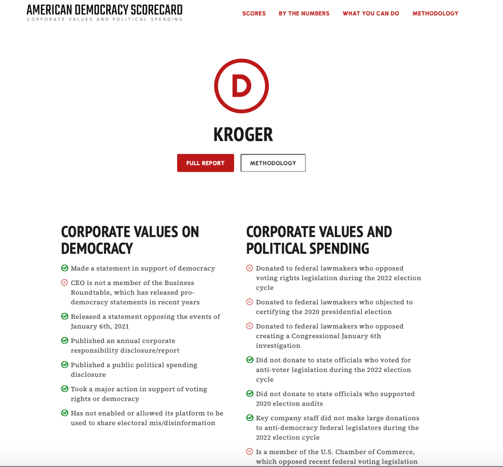 The American Democracy Scorecard gives Kroger a “D,” which isn’t great, but shockingly, is not the worst score for a grocer. It’s way worse than Costco, though, which I analyzed here.